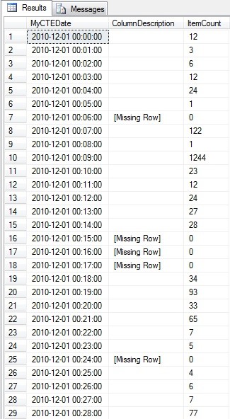 We can then select from it and use a LEFT OUTER JOIN to our table with data, and use the CTE dates to fill in the gaps.