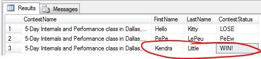 Let’s say we have a database with entry data for a contest. The contest is, quite coincidentally, the SQLSkills Master Immersion Event on Internals and Performance in February!