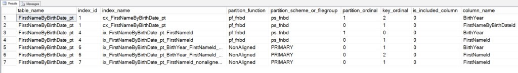 Here’s a sample of what the output looks like for a database with one partitioned tables– at least the most interesting columns. My partitioned table is using BirthYear, which is an int column, as the partitioning key. I currently have two indexes on the table.