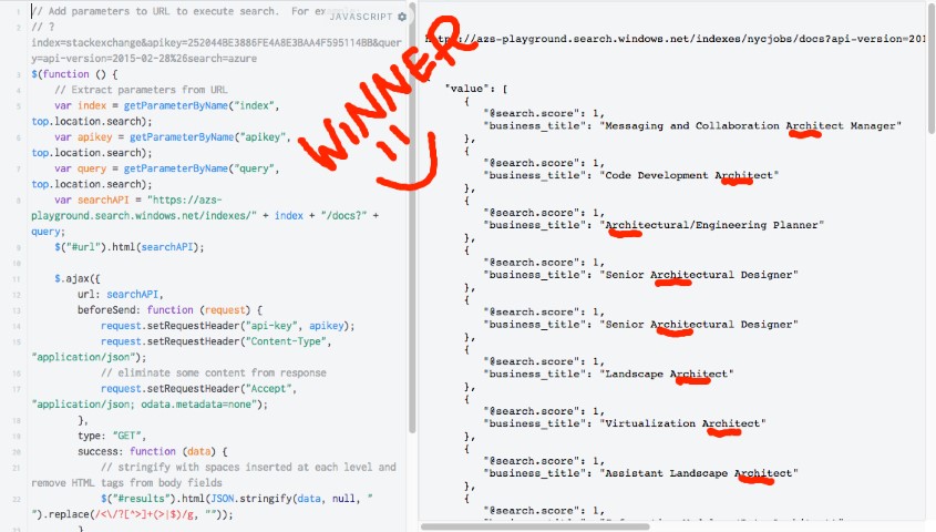 Someone else quickly responded to the tweet and explained that Azure Search does support wildcard searches, but it’s only for prefix searches. So if you’re looking for jobs that contain the word ‘Architect’, your query could say: show me all job titles where there’s a word leading in Arc*.