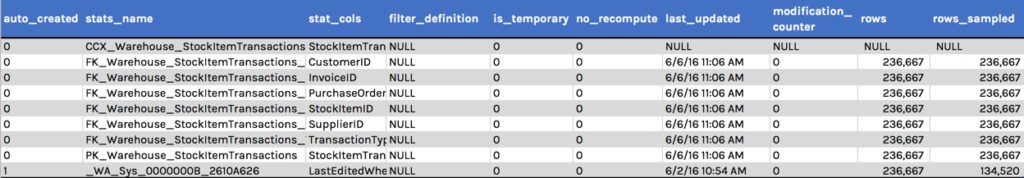 For these instances, it’s not a big deal to get the date statistics were last updated - we can call to the STATS_DATE() function. But we’re really guessing when it comes to how many rows have been modified, we have to use a column called rowmodctr in sys.sysindexes which is a guess at how many rows have changed. It also was wildly inaccurate in some versions of SQL Server 2005.
