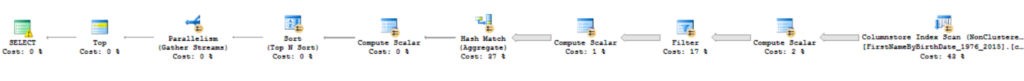 Looking at the execution plan, SQL Server decided to scan the non-clustered columnstore index, even though it doesn’t contain the computed column BirthYear! This surprised me, because I have a plain old non-clustered index on BirthYear which covers the query as well. I guess the optimizer is really excited about that nonclustered columnstore.