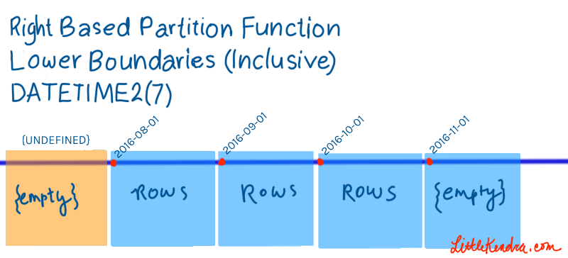 Left based partitioning can require being particularly nitpick-y if you’re working with the DATETIME or DATETIME2 data types. For example, if you’re partitioning by month, you typically don’t want the first moment of a month to be physically stored with data from the previous month– so you have to specify the last second of the last hour of the last day of the month at the boundary point. (Related fact: DATETIME is peculiar because it rounds microseconds to increments of 0, 3, and 7)