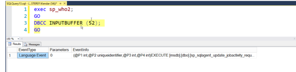 I can plug the session id from the SQL Agent activity I saw in sp_who2 into this and get an idea of the last thing it ran.