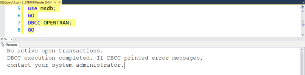 I saw in sp_who2 that session 52 was in the msdb database. I can run DBCC OPENTRAN and check what the oldest active transaction is. In this case it tells me that there’s no open transaction, so session 52 seems like it’s OK.