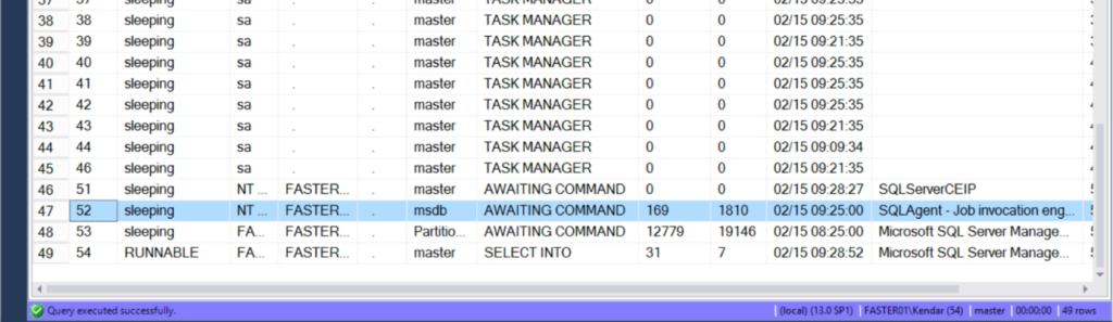 Session 52 is a very similar case: it’s awaiting command, and it’s part of the SQL Server Agent.