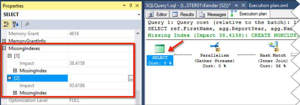 With that top left operator highlighted, I open the properties window and, voila– I can expand ‘Missing indexes’ and quickly tell that there are two index suggestions for this query: