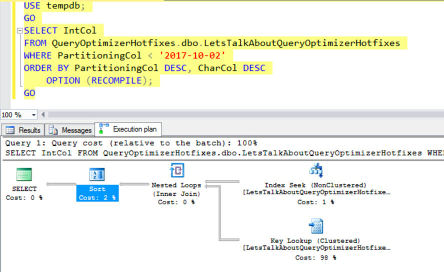 But what would my plan look like with Query Optimizer Hotfixes off? When I compile the query from tempdb (which doesn’t have the setting enabled) using three part naming, the bug is there and the plan has a SORT operator: