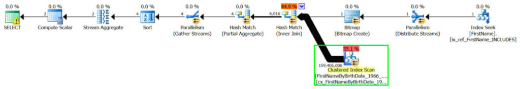 We wrote our query putting a predicate on FirstName on the dimension table, ref.FirstName, then joined over to dbo.FirstNameByBirthDate_1966_2015. SQL Server has to generate the execution plan for the query before it runs. It can’t query ref.FirstName and find out what the FirstNameId is for Matthew, then use that to figure out what kind of join to use.
