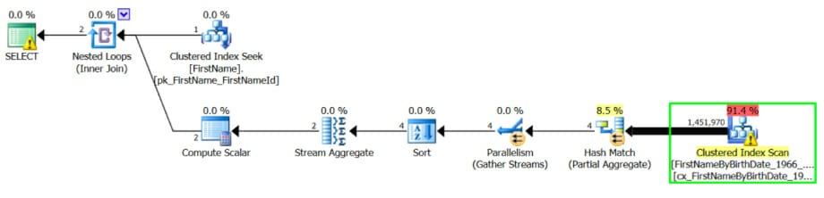 This query takes around 5 seconds (instead of 13 seconds). Scanning that clustered index isn’t awesome, but it’s more than twice as fast as using the imperfect nonclustered index on FirstNameId and then going back to look up Gender.