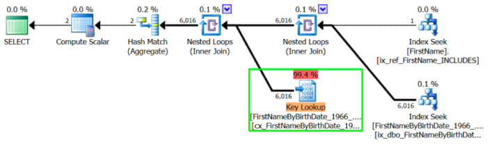 Since that’s not a lot of rows, it decides to use the narrow nonclustered index on FirstNameId to find the Matthews, and then go do a key lookup to pick up the Gender column in the clustered index of the table. Here is what the estimated execution plan looks like: