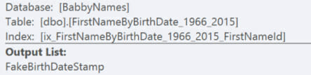 This time, SQL Server chose to scan the nonclustered index on FirstNameId. Looking at the properties of the scan, it figured out that FakeBirthDateStamp would be there (because of the clustering key), and decided to scan this nonclustered index and output just that column: