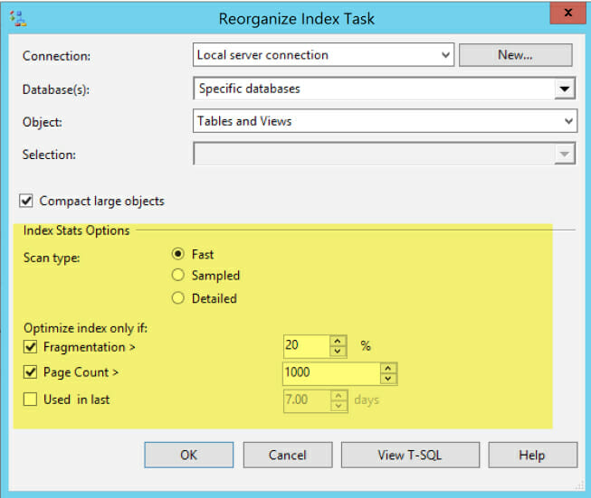 Instead, this part of the dialog lets you control how the task checks the level of fragmentation in the index from the sys.dm_db_index_physical_stats DMV: Fast = ‘LIMITED’, Sampled = ‘SAMPLED’, ‘Detailed’=‘DETAILED’. (I did some tracing to confirm the mapping.)