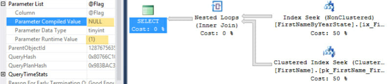 We can confirm that this plan was optimized for @Flag = null by looking at the properties of the SELECT operator in the actual plan: