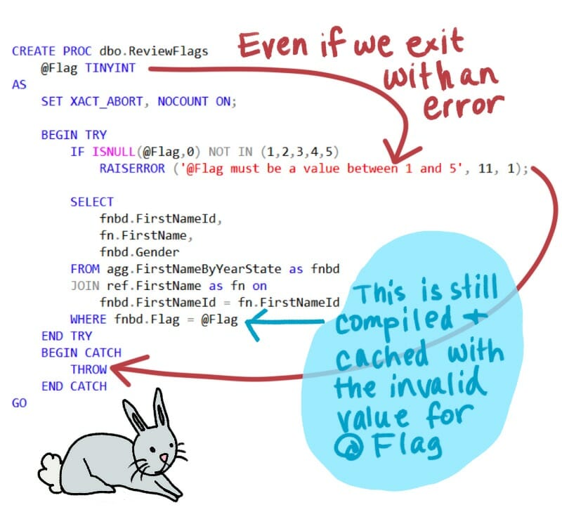 The first time that dbo.ReviewFlags is executed after the database comes online, it’s with an invalid parameter, like this: