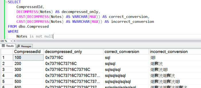 In this case, I compressed VARCHAR data. Here’s what it looks like reading the data with just plain DECOMPRESS(), and DECOMPRESS() converted to VARCHAR and NVARCHAR.