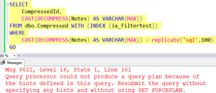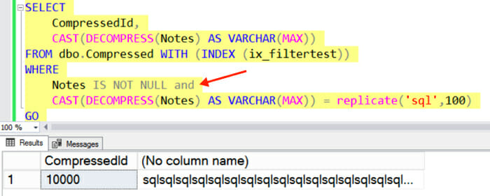To get SQL Server to use this index, we may have to write our queries carefully, though. Just using the ‘Notes’ column in a predicate doesn’t do it: