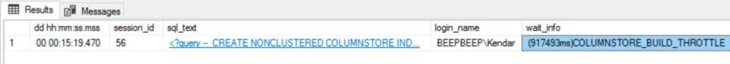 Running Adam Machanic’s free sp_WhoIsActive procedure, I can see that I am constantly waiting on columnstore_build_throttle: