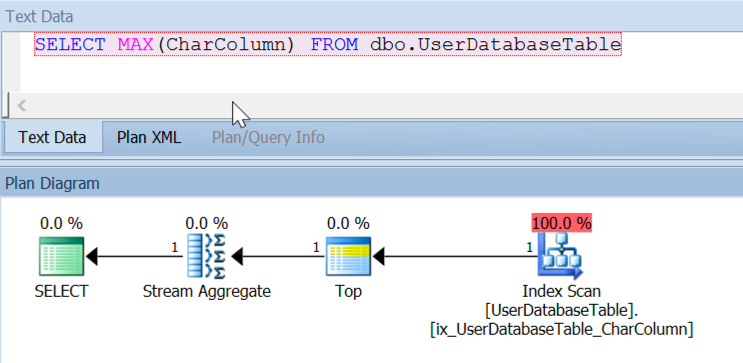 When this CHAR(13) column has is_ansi_padded set to 0 (false), the MAX() operation generates an index scan that feeds the data into a stream aggregate operator.