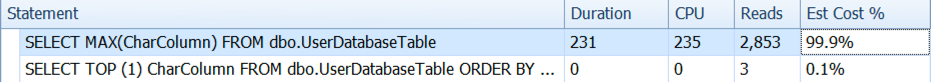 These metrics are for the queries in a simple, narrow table with a single column nonclustered index on CharColumn. Add more rows and more complexity, and the performance difference will just get uglier.