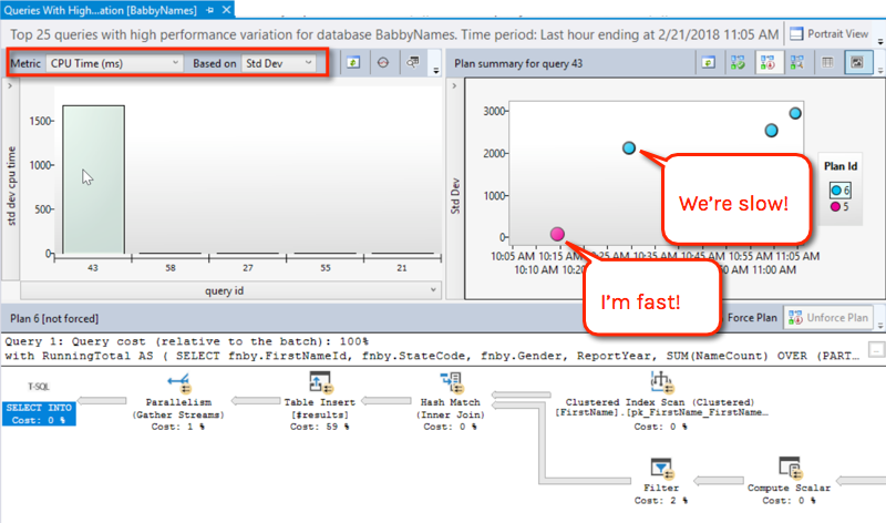 My problem query pops right to the top of the list with its fast and slow plans right in the graph.