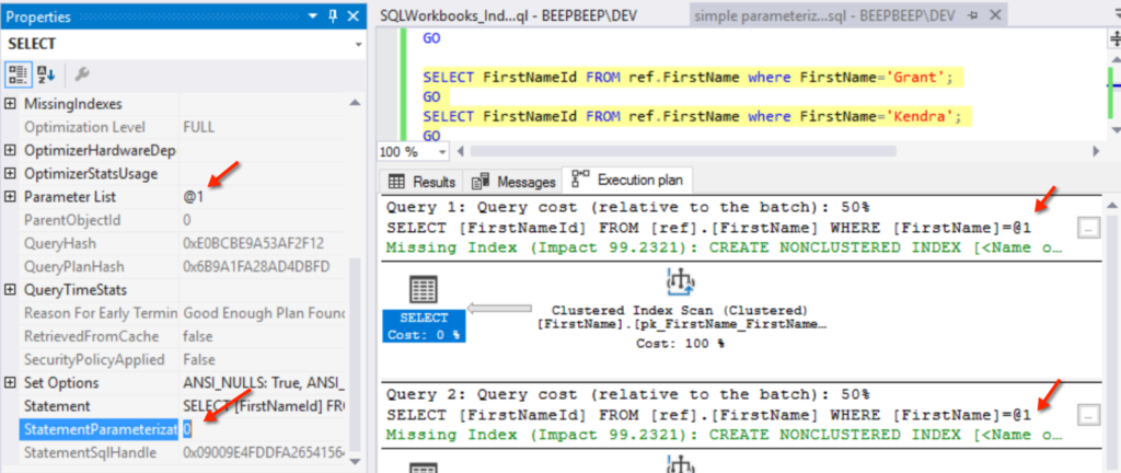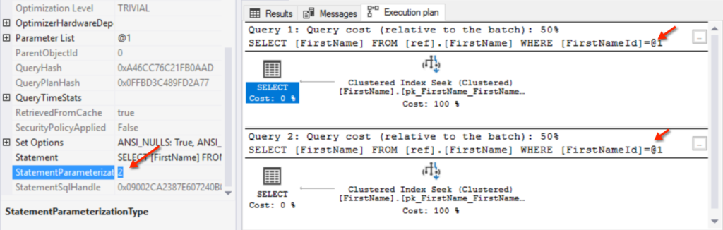 Just because I see an @1 being substituted in for a literal value in that text hint at the top of a plan doesn’t mean that simple parameterization has actually happened.