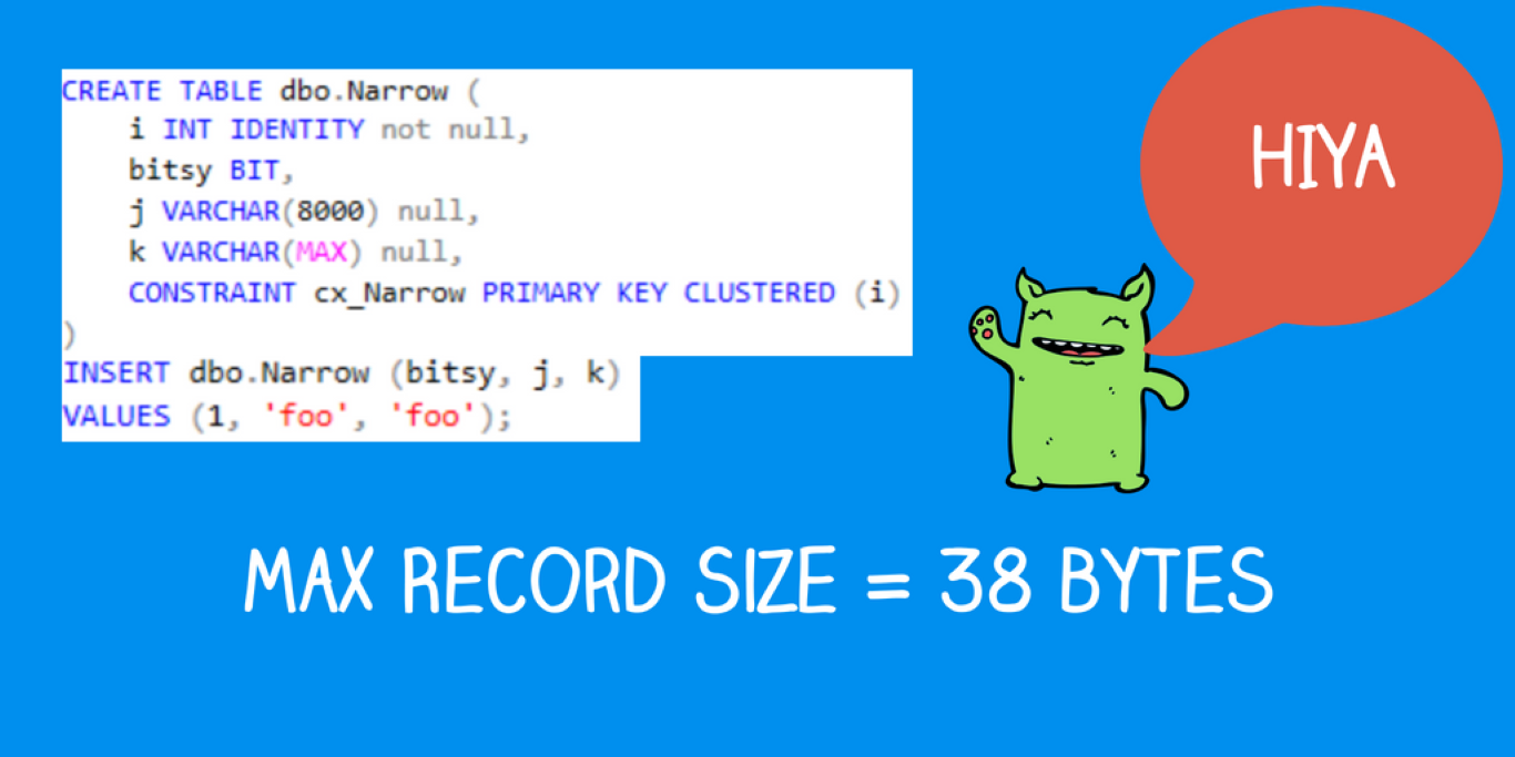 I measured the width of the largest row in dbo.Narrow using sys.dm_db_index_physical_stats. It only has one row, so the max width IS our row width. It’s a lil bitty 38 bytes.