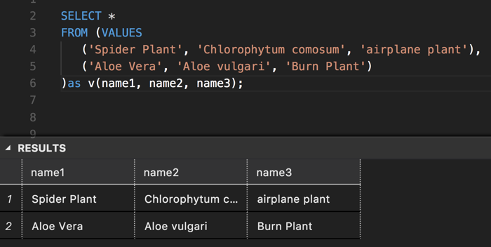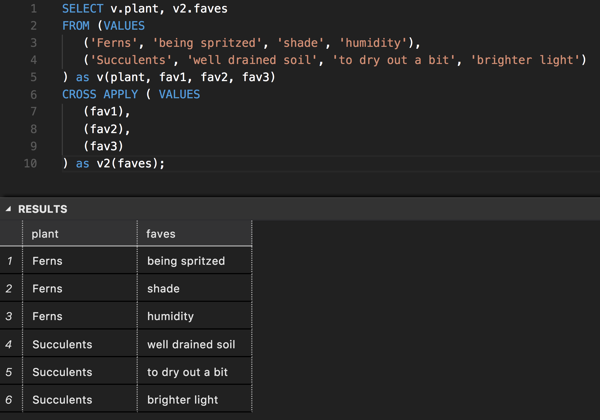 The first table value constructor (v), is a two row table with four columns: plant, fav1, fav2, and fav3.