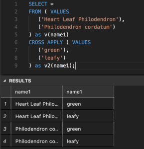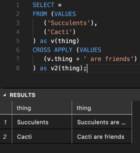 Whoo, the second table value constructor (v2) is doing something interesting this time: it’s referring to the dataset produced by the first table value constructor (v1), and concatenating on a literal value to the ’thing’ column.