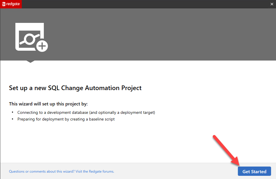 In the ‘SQL Change Automation’ window, I clicked ‘Create Project’, selected ‘SQL Change Automation Project’ and gave it a name, and click OK. This launched the wizard to set up the project.