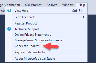 I went into the ‘Help’ menu in Visual Studio to capture the version numbers of my extensions (that’s under Help -> About Microsoft Visual Studio), and that’s when I realized: I should probably update Visual Studio before I wasted any more time chasing this error.