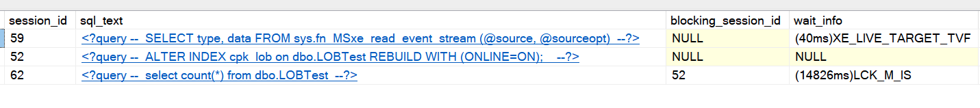 Here’s what you should see: Your supposedly online index rebuild blocking your select query, which is waiting with a LCK_M_IS lock wait: