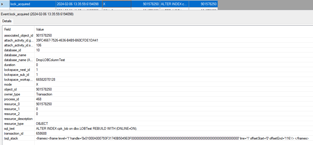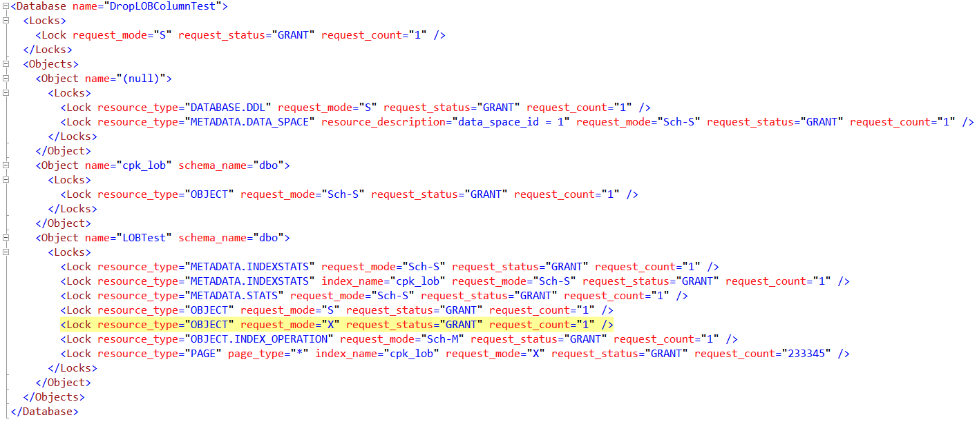 If you open the XML column for the locks for the ALTER INDEX statement, you should see that the ALTER INDEX statement has been granted an X (exclusive) object lock on dbo.LOBTest. There are also a bunch of exclusive page locks– in this case 233,345 of them.