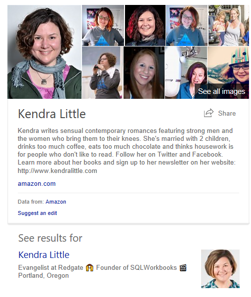 Most of those pictures are of me, but a careful reader will note that the biography at the top references a domain name that, sadly, dear reader, I do not own. Someone out there named Kendra Little gets sweet royalties from her contemporary romance novels, but they don’t come to this address.